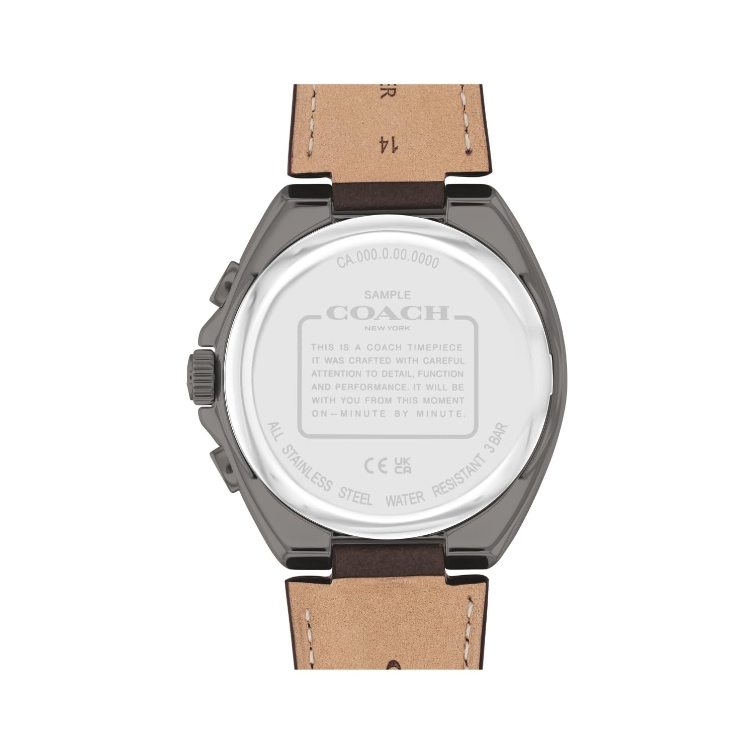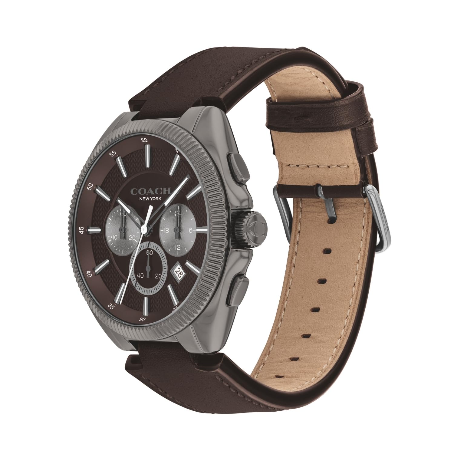 Look modish by donning this men watch from the jackson collection by Coach. The brown round dial is secured by a mineral glass. It displays analog, and a crown for time adjustment. The leather strap showcases a brown hue that uplifts the look of the timepiece.