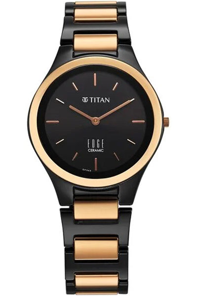 The Titan Edge Ceramic is a sophisticated timepiece, designed for those who appreciate sleek, contemporary style. Powered by the precise T9081 in-house calibre, this watch combines elegance with functionality. Crafted from premium ceramic, the case is known for its scratch-resistant properties, ensuring durability without compromising on style. Its slim design, with a thickness of just 4.4 mm, enhances comfort and adds to its refined look. The watch is fitted with a black and rose gold ceramic strap featuring a glossy finish, which integrates seamlessly with the case for a cohesive design. The black dial, protected by scratch-resistant sapphire crystal, features minimalist rose gold accents, including sleek hands and indices, which add a touch of luxury. A key feature is its water resistance of up to 30 meters, making it suitable for everyday wear while retaining its elegant appeal. This watch is perfect for those who seek a stylish, lightweight watch that transitions effortlessly from casual to formal settings