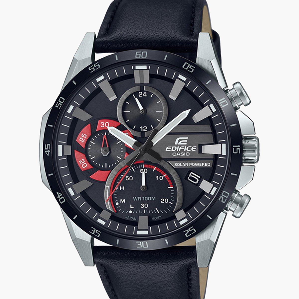 Take control of speed and intelligence with a solar-powered EDIFICE inspired by the sports car disc brake rotor. The EQS-940BL solar-powered chronograph features striking inset dials in a watch face designed with depth and dimension. Thick, sharp index markings add bold accents that make a powerful statement. With a second hand marked in eye-catching red, plus red inset dials evoking the way a rotor glows red-hot when you slam on the brakes, this sporty design is all about the EDIFICE motorsports concept. Exuding speed and control, this timepiece also delivers practical utility with a scratch-resistant black ion-plated bezel and solar charging system that stores enough power for 5 months of normal use when fully charged. Genuine leather band for a final touch of style.
