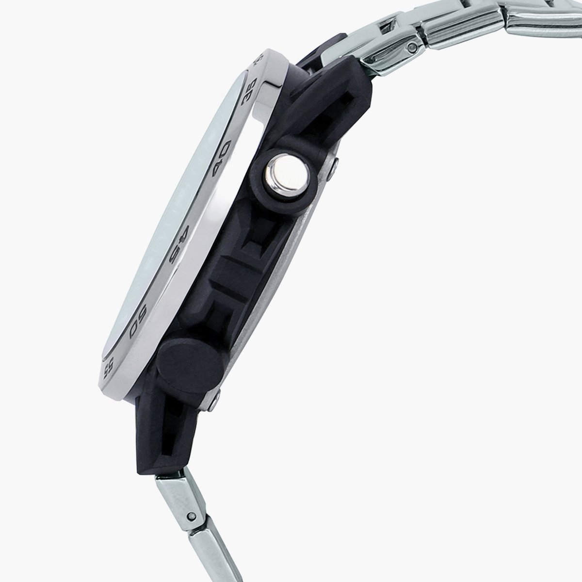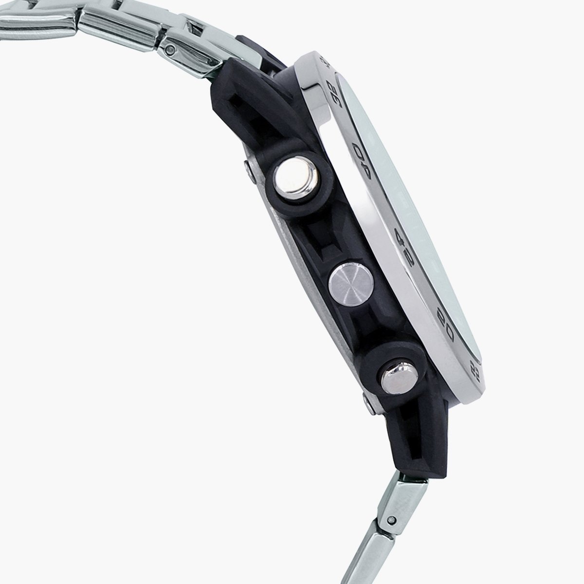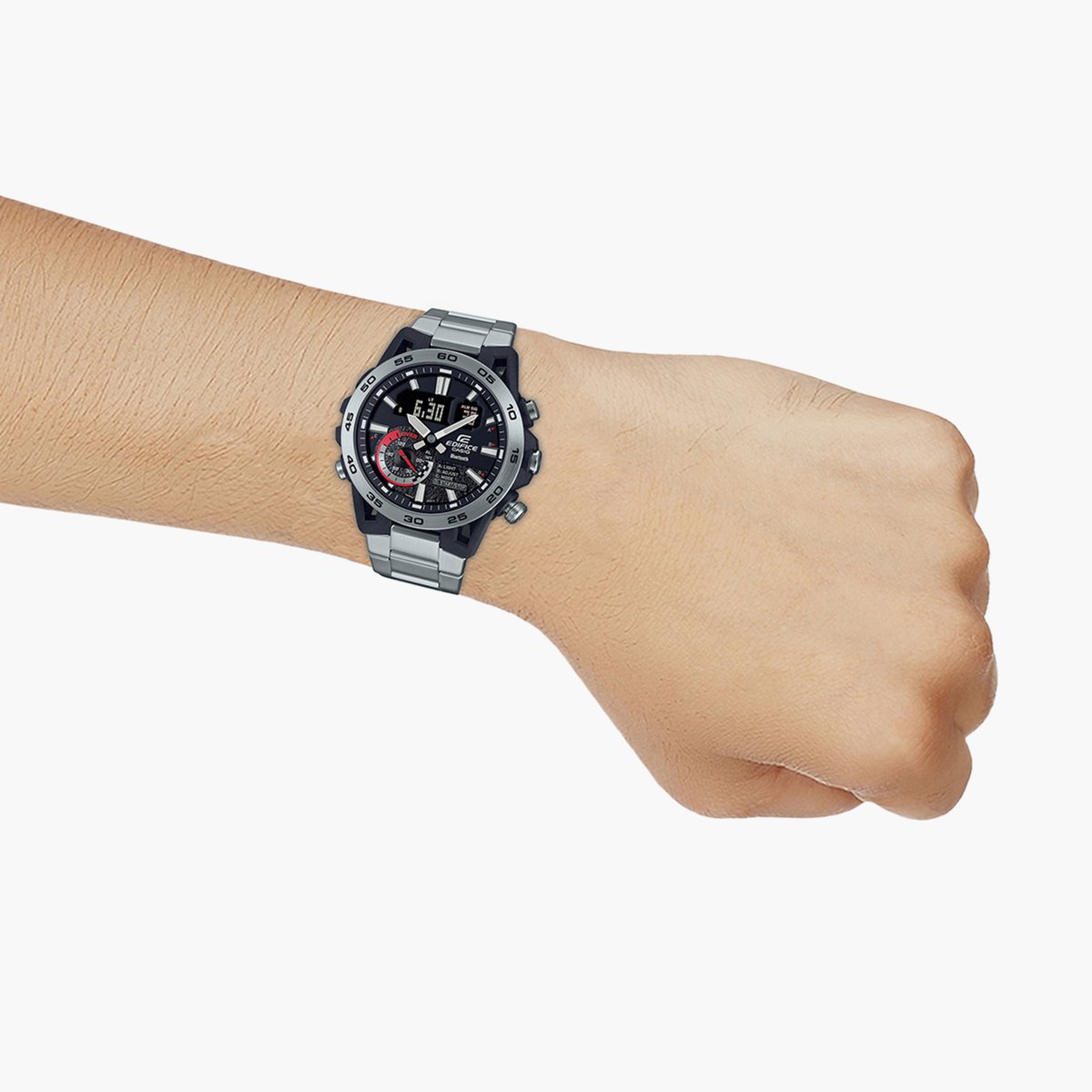 Introducing true motorsports form, functionality, and sophistication — the EDIFICE SOSPENSIONE ECB-40, with carbon fiber reinforced resin suspension arm design and Smartphone Link. The unique case design is inspired by formula car suspension with lugs configured in a four-arm arrangement, two above and two below. Carbon fiber-reinforced resin delivers a case that is lightweight, yet strong. Thanks to Smartphone Link, this special timepiece automatically connects when within range of a paired smartphone. Tap into the app to access functions that are so important for racing teams — get automatically adjusted to-the-second precision timekeeping, effortlessly manage world time, and transfer stopwatch data measured to the millisecond for up to 200 lap times to your smartphone. The Super Illuminator high-luminosity double LED illuminates the digital-analog display for easy readability, even in the dark.