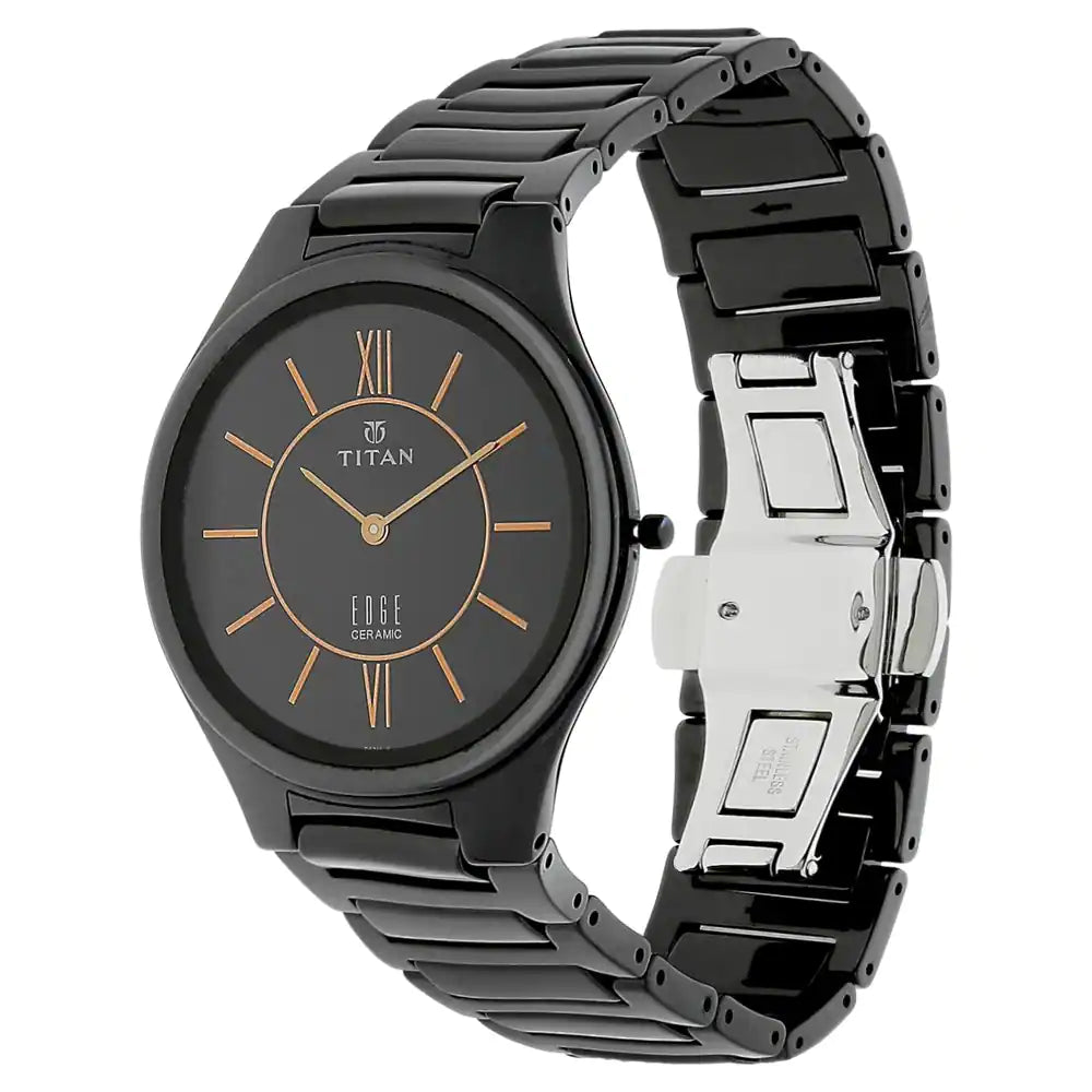 Enhance the level of your style by wearing this men's analog watch from the Edge Ceramic collection by Titan. Its round-shaped black dial is protected in a case of 40.5 mm diameter. The ceramic bracelet of this watch exudes a black hue for an eye-catching look. The inclusion of a plain 2-hand quartz movement keeps you on time.