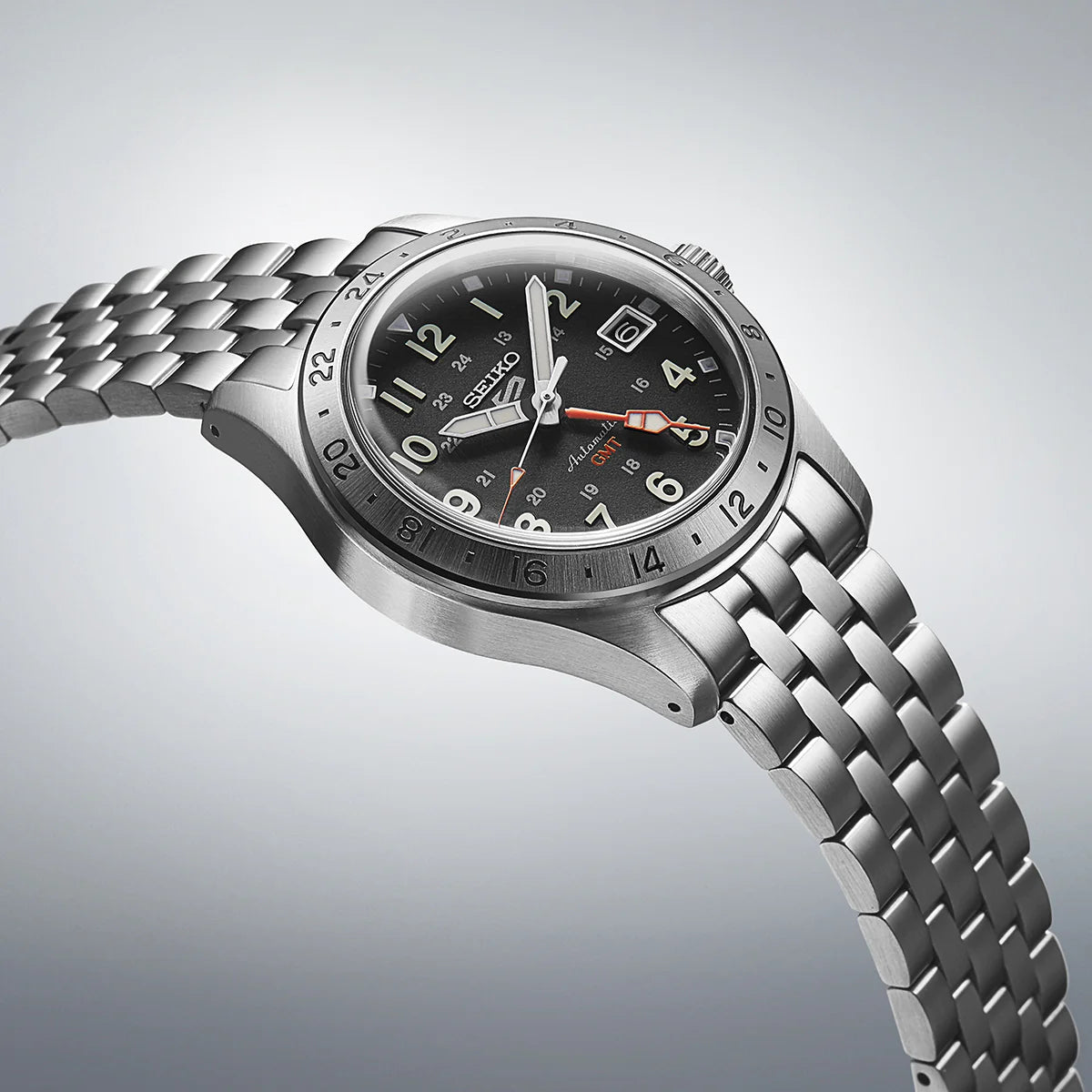 The Seiko 5 Sports Field collection was created with an ‘in the field’ military design –taking inspiration from a style originally called a ‘trench watch,’ created to be robust and reliable in tough conditions –echoing the Seiko 5 Sports characteristics.This Seiko 5 Sports ‘Deception’ field watch with its black dial and bezel takes the design to the next level, with a GMT function that allows you to track a second time zone. The black-coloured bezel features a 24-hour indication and a large, orange GMT hand for legibility. The base design and size remains the same as the original field watches, ensuring that the design style remains timeless whilst the calibre evolves. Whilst being a robust sports watch, this piece has a black calf leather strap.Seiko 5 Sports is known for over fifty years of reliability, durability, performance and value. ‘’5’’ represents the original five key features of every Seiko 5 still present today: Automatic movement, Day-date display, Water Resistance, Recessed crown and Durable case and strap.